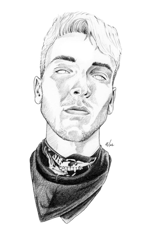 All his works are hand-illustrated with graphite and ink on paper - some adorned with digital typography and design.